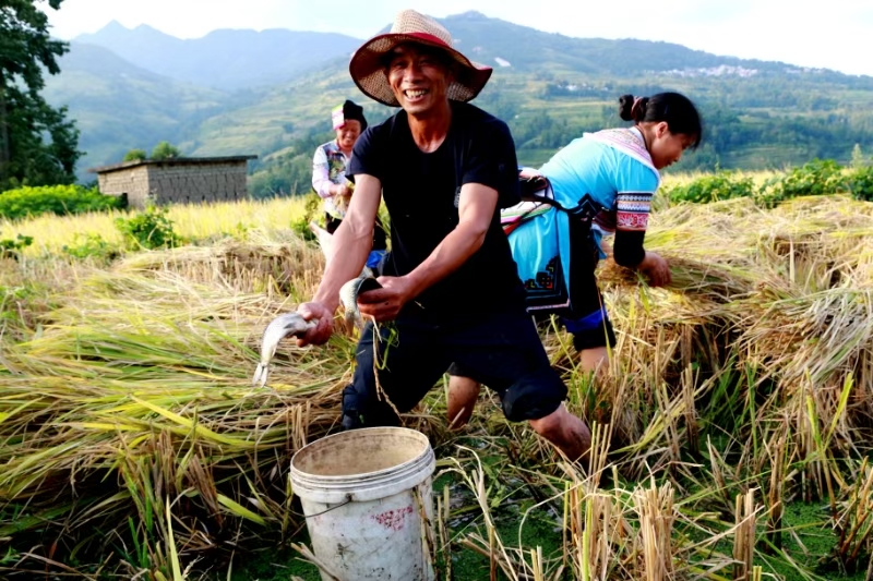 “稻鱼鸭”综合种养,解锁世界文化遗产区生态保护和群众增收共赢“新密码”。通过建立“党组织+公司+合作社+基地+农户”利益联结机制,在哈尼梯田遗产区核心地带,创新推广“稻鱼鸭”综合种养模式3.92万亩,形成“一丘田、一粒米、一条鱼、一枚蛋”完整产业链,让亩产值从不足3000元提升至8400余元,该模式荣获全国创新大赛特等奖,梯田红米被认定为“云南六大名米”之一,元阳县荣获全国粮食生产先进县、国家级稻渔综合示范区、国家级水产健康养殖和生态养殖示范区、“中国生态红米之乡”等荣誉称号。