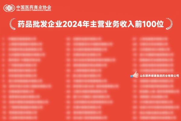 近日,由中国医药商业协会主办的“2025药品流通行业信息大会暨医药流通创新大会”在杭州召开。会议发布了“2024年药品批发企业主营业务收入前100位”名单,山东健康所属健康药业入选。