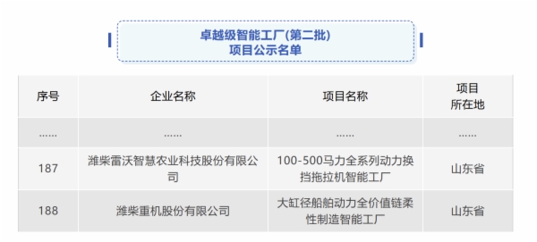 近日,工业和信息化部发布的2025年度卓越级智能工厂项目名单公示结束,山东重工所属潍柴雷沃智慧农业、潍柴重机两家工厂入选。至此,山东重工共有6家工厂获评国家级“卓越级智能工厂”。