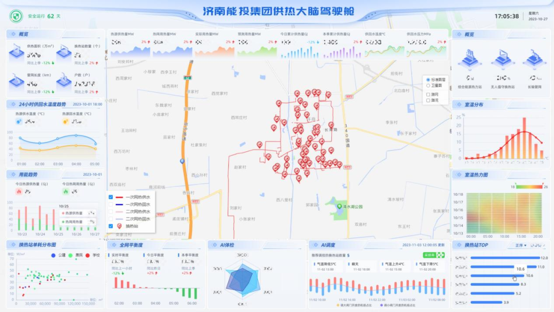 针对北方供热管网大、滞后长、难精调、能耗高等痛点,基于"源-网-端"数据研发核心数据体检、负荷预测、均衡调控等算法,已在济南商河县应用示范,能有效消除大热网传输滞后带来的"时空"热量失衡,实现供热智慧监管、智慧调控与智慧运营,构建绿色高效供热系统。