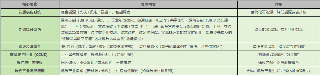 白皮书明确零碳园区并非“绝对零碳”,而是通过“碳排放总量与吸收动态平衡”实现低碳发展,其核心构成需覆盖六大维度:
