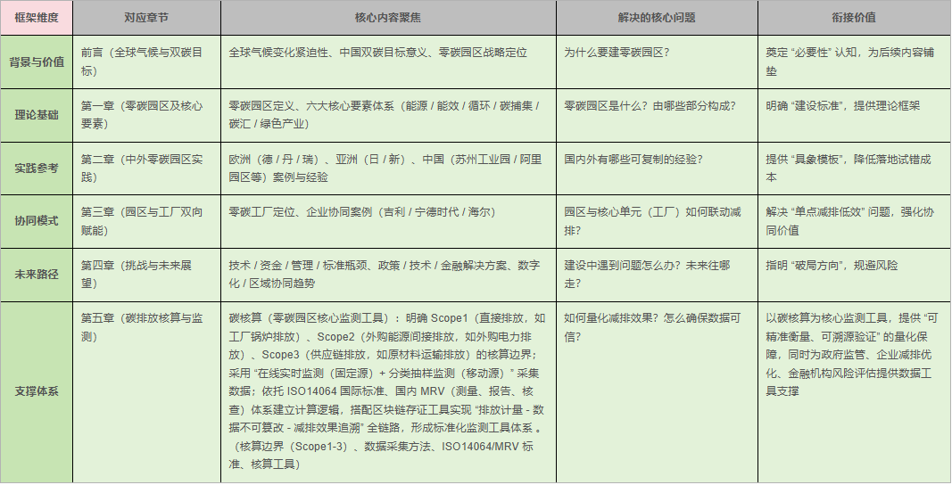 白皮书以“破解资源环境约束、重构产业竞争力”为核心目标,围绕“双碳”目标下零碳园区建设的全链路需求,构建了“背景-理论-实践-协同-挑战-支撑”的六维逻辑框架,既提供理论支撑,又给出可落地的操作方案,同时明确不同主体的参与路径。其整体结构与核心功能如下表所示: