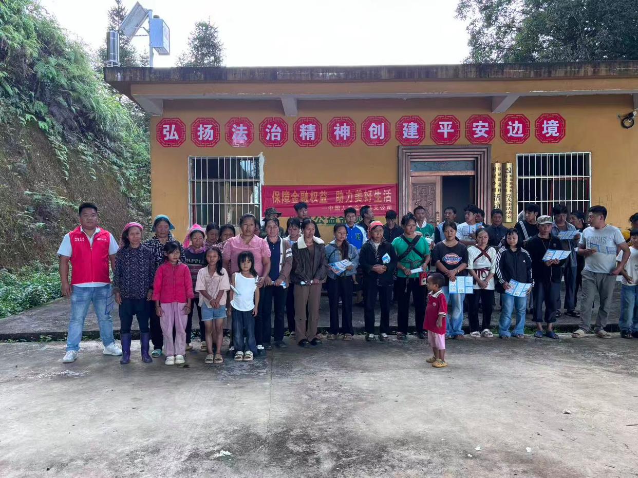 9月18日晚,公司工作人员驱车3个多小时,深入抵边村寨勐拉镇翁当村委会拉祜新寨村小组,开展“风险提示送上门”活动。针对村民在家的时段,为约80人(占村小组80%村民)讲解金融知识,发放120余份宣传单,并赠送300余份生活用品,将乡村振兴与金融教育相结合,以教代扶,显著提升了少数民族群众的金融风险防范水平。