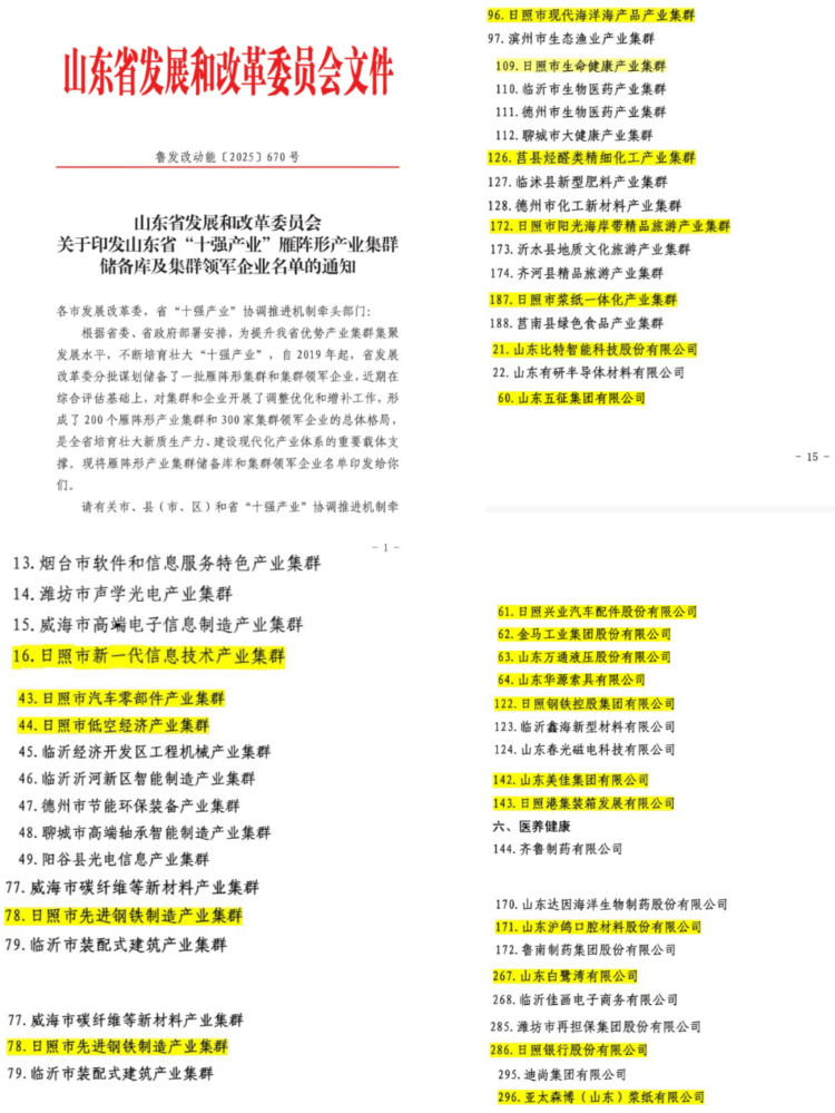 近日,山东省发改委公布省“十强产业”雁阵型产业集群、第二批支柱型雁阵集群和集群领军企业名单。其中,日照低空经济产业集群、日照浆纸一体化产业集群新入选2025年度省“十强产业”雁阵形产业集群,和临沂市联合申报的日临先进钢铁产业集群新入选省第二批支柱型雁阵集群,日照港集装箱发展有限公司新入选省“十强产业”集群领军企业。截至目前,日照市共有省“十强产业”雁阵形产业集群9家、支柱型雁阵集群3家、集群领军企业13家。