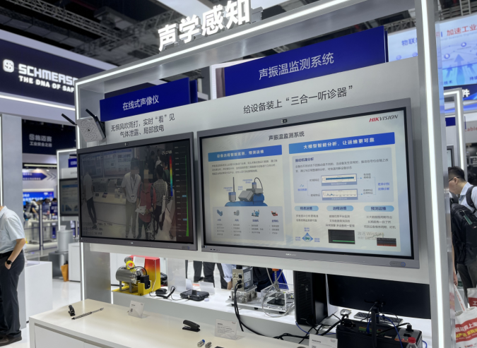 在声学感知展区,声音不仅可以听出故障,还能“看见”隐患,为工艺过程质检和设备设施运维管理提供可靠解决方案。例如声振温监测系统用一个探头就能实时监测工业设备的声音、振动、温度,及时发现异常,保障产线正常运转;在线式声像仪则可以通过声音“看见”隐患,定位气体泄漏、局部放电等位置,助力变电站、液化气站等提升安全管理水平。