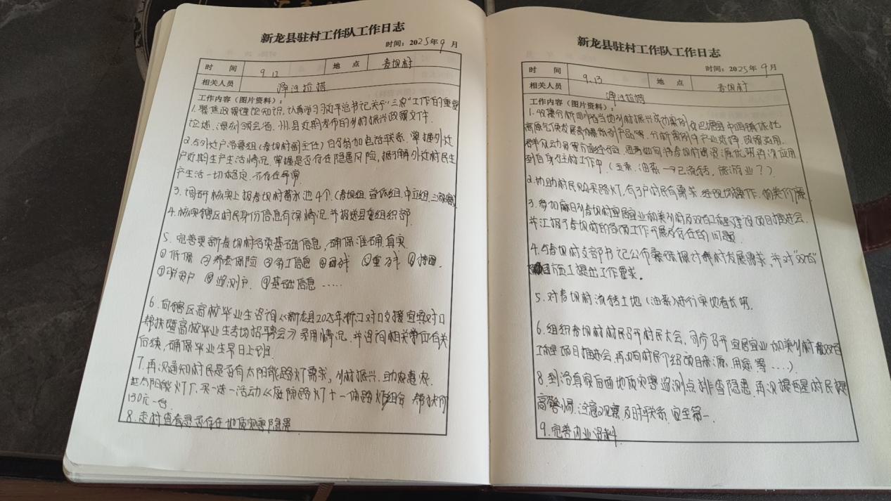 9月12日,川观新闻·甘孜观察记者来到新龙县麻日乡麦坝村,海拔3400米的高原上,凛冽的风裹挟着寒意。走进村委办公室时,映入眼帘的是堆满各类材料的办公桌,文件、报表、项目计划书有序地摞成小山,一本摊开的驻村工作日志上,密密麻麻记录着每天的工作记录。