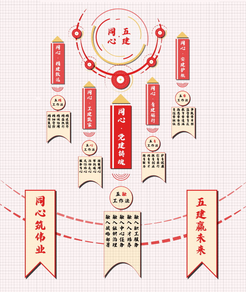其中,“同心·五建”是中建六局第五建设有限公司主品牌,承袭中国建筑“建证”品牌精神和中建六局“建证·心动力”党建特色品牌内核,寓意“上下同心、共建共享”。“同心”既是“砼心”的谐音,更寓意以混凝土般的团结凝聚力,筑牢基层组织根基,凝结发展合力。品牌口号为同心筑伟业,五建赢未来。体系目标聚焦党建、工会、团青、履约、安全五大业务板块,构建协同联动的一体化品牌体系,着力筑牢红色根基、传递五建温度、激发青春动能、塑造履约口碑、守牢安全底线,推动组织力、凝聚力、执行力与安全力全面提升。