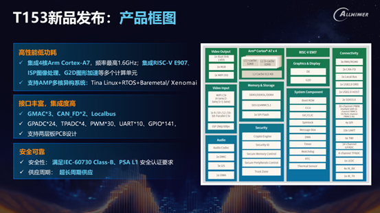 在接口方面,T153配备了三个千兆以太网接口、两个CAN-FD接口和LocalBus,能支持高吞吐量网络连接,满足复杂数据驱动型应用需求。其集成的图像信号处理器和显示引擎可为精密制造流程管理提供清晰的实时视觉反馈。
