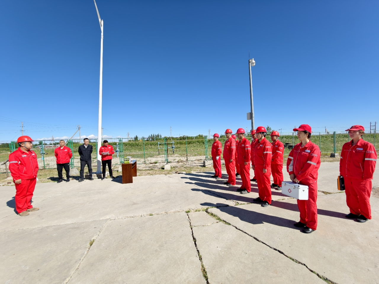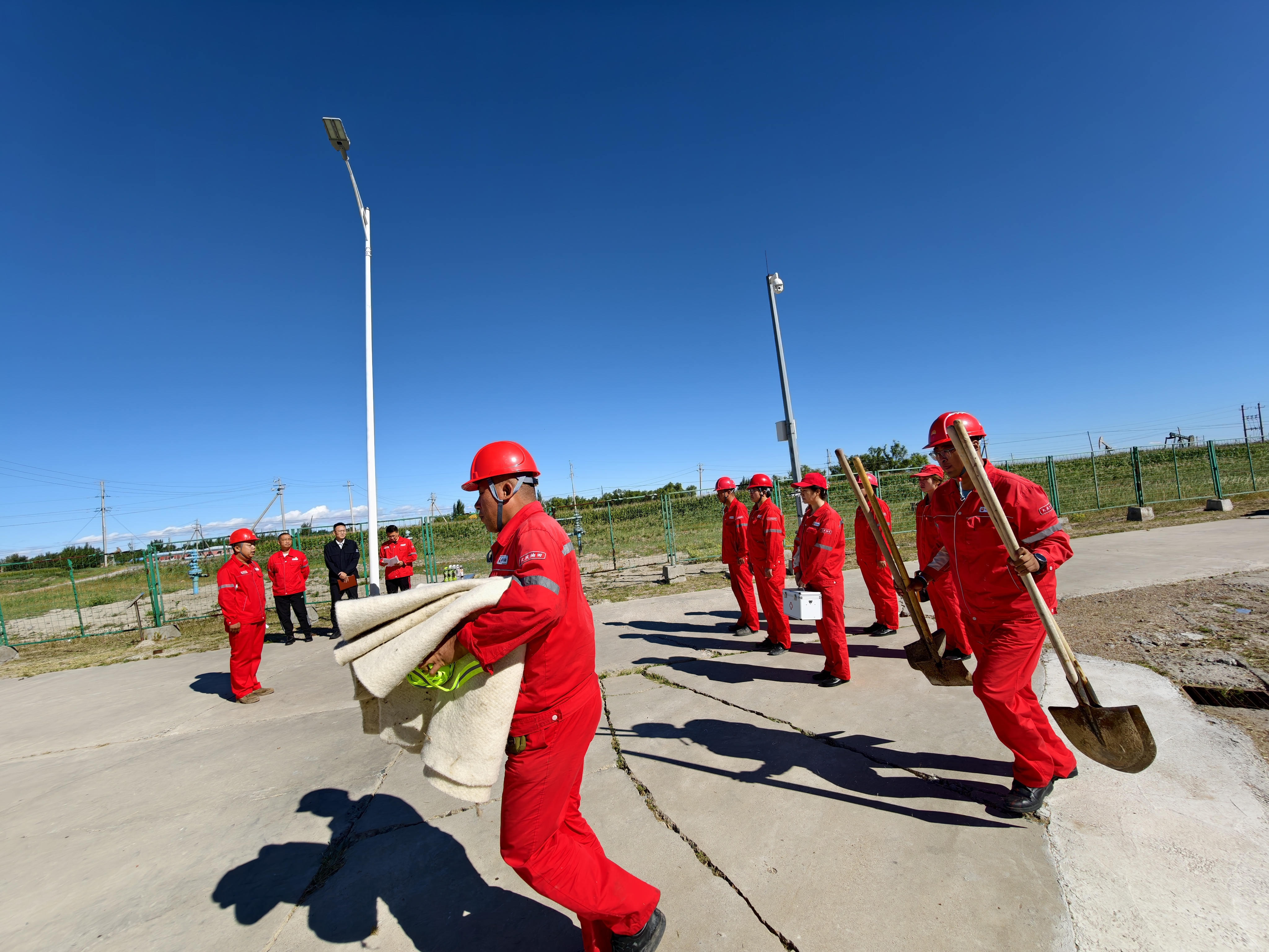 演练模拟了集输班小班巡检人员发现“站外88年注水干线”因腐蚀发生高压水泄漏的险情。抢险组贾盟率员背起工具包,3分钟抵达泄漏点,上下游阀门同时关闭,压力表指针迅速归零;后勤保障组杨光带人肩扛围堰板、百米警戒带,10分钟完成现场封控,编织袋层层垒起,浊水被牢牢锁在核心区域;疏散引导组逐点清点,岗位、车辆、外协队伍“一人不漏”撤至安全区,应急通道保持双向畅通;通信联络组对照清单,5分钟内把“事故时间、地点、压力、介质”四要素传至作业区调度,请求消防、医疗备勤;医疗救护组携担架、氧气袋现场待命,模拟救护“受伤”巡检工,止血包扎一气呵成。
