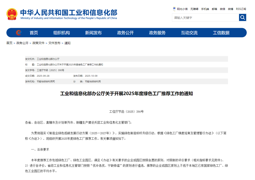 近日,工业和信息化部印发通知,部署开展2025年度绿色工厂推荐工作。
