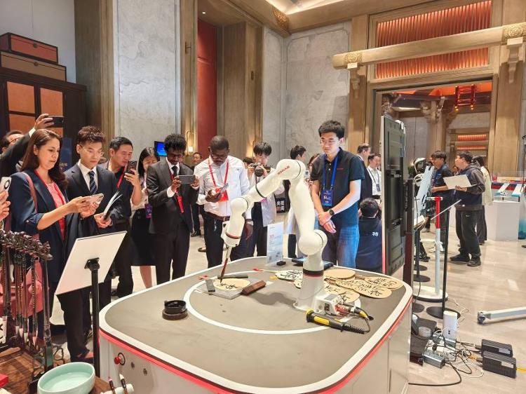 珞石书法机器人与赛飞特机器狗同台亮相。只需选定扇面内容,珞石书法机器人就可化身"书法家"蘸墨、运笔、挥毫,精准复现大师级笔迹,在行云流水间完成扇面题字,呈现"版权+工业"的创新成果。