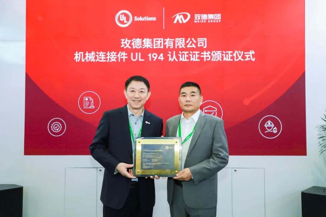 在近日举办的第二十一届中国国际消防设备技术交流展览会上,玫德集团荣获由ULSolutions颁发的三项重要产品认证证书,包括机械连接件UL194认证、抗震支架UL203A认证以及铜末端试水阀UL258认证。这一重要成果标志着玫德集团在消防产品领域的研发制造能力已达到国际先进水平。