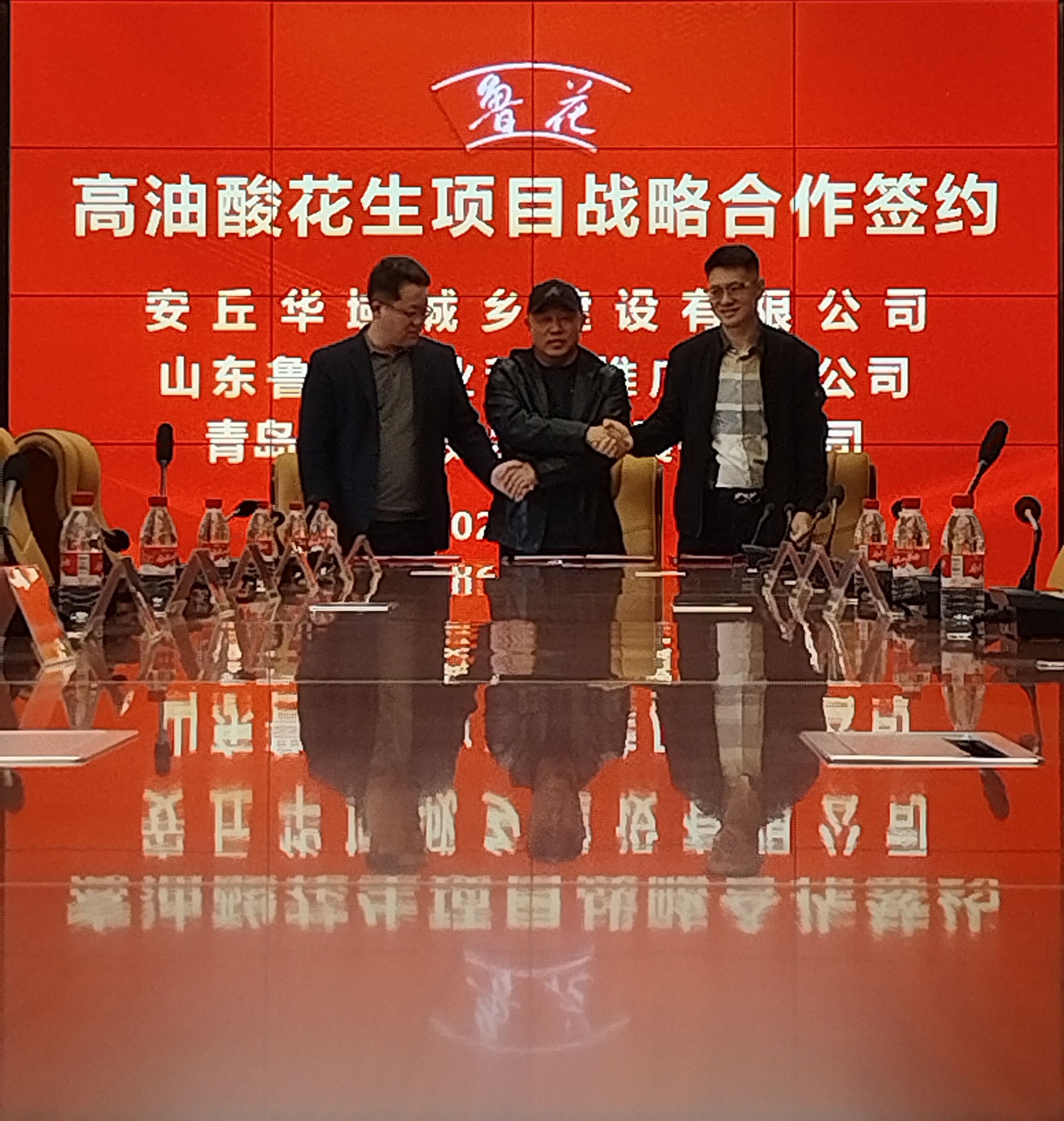 10月24日上午,安丘市高油酸花生项目战略合作签约仪式在鲁花集团总部举行。安丘市农业发展投资集团有限公司副总经理王小亮、安丘华域城乡建设有限公司总经理张建平、鲁花集团农业推广负责人郑军卫、青岛先禾高效农业有限公司总经理张帅、潍坊华禾农业科技有限公司总经理王立军和有关银行系统负责人出席活动。