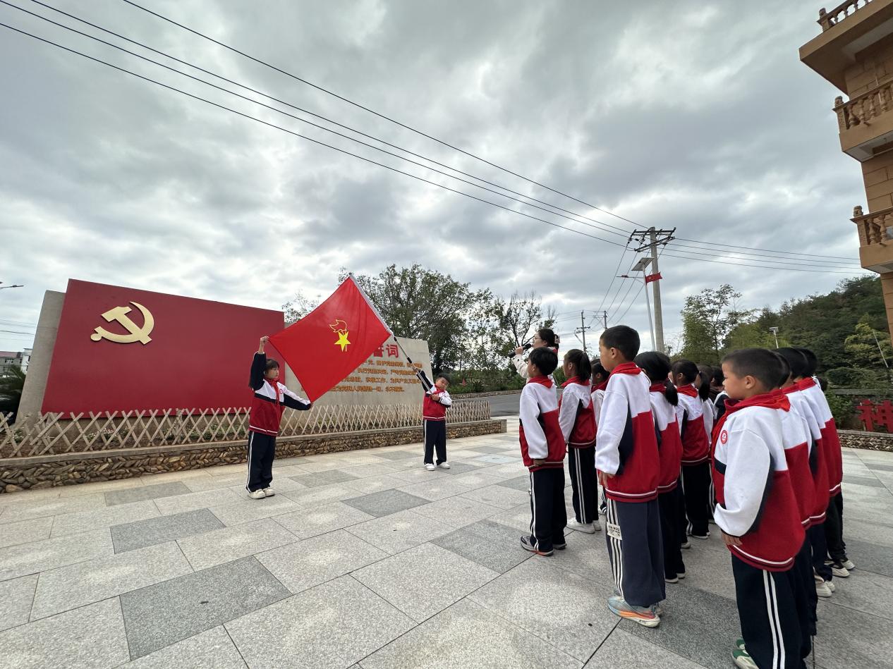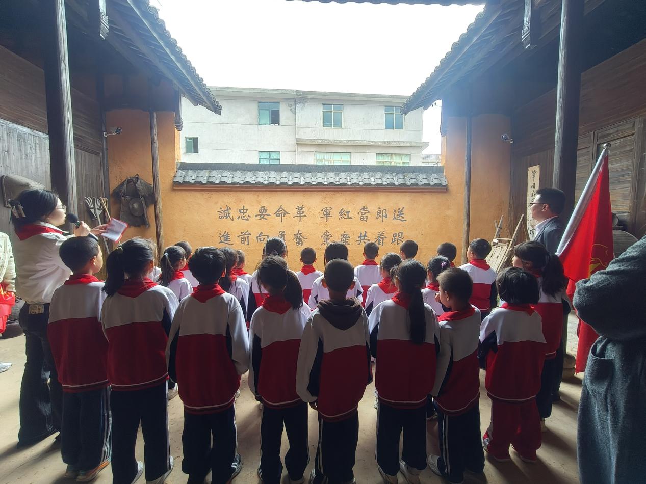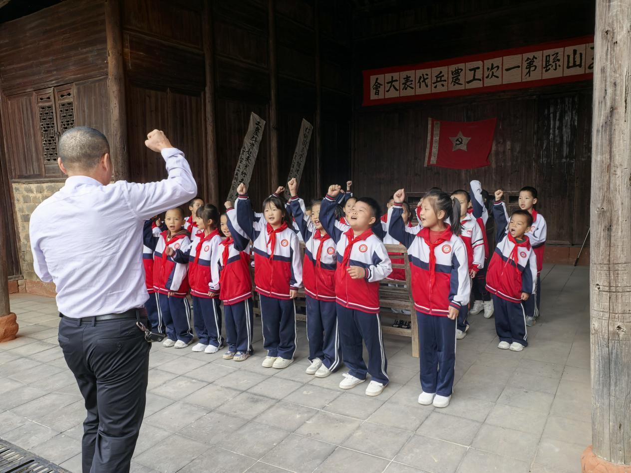 党课结束后,党员教师周益宏带领队员们学唱红歌《土地革命歌》。“土地革命要完成,全靠工农兵。大家使劲干,站稳脚步向前进……”激昂的旋律、铿锵的歌词回荡在旧址上空,队员们精神饱满、放声歌唱,在传唱红色经典中感悟革命精神的磅礴力量。