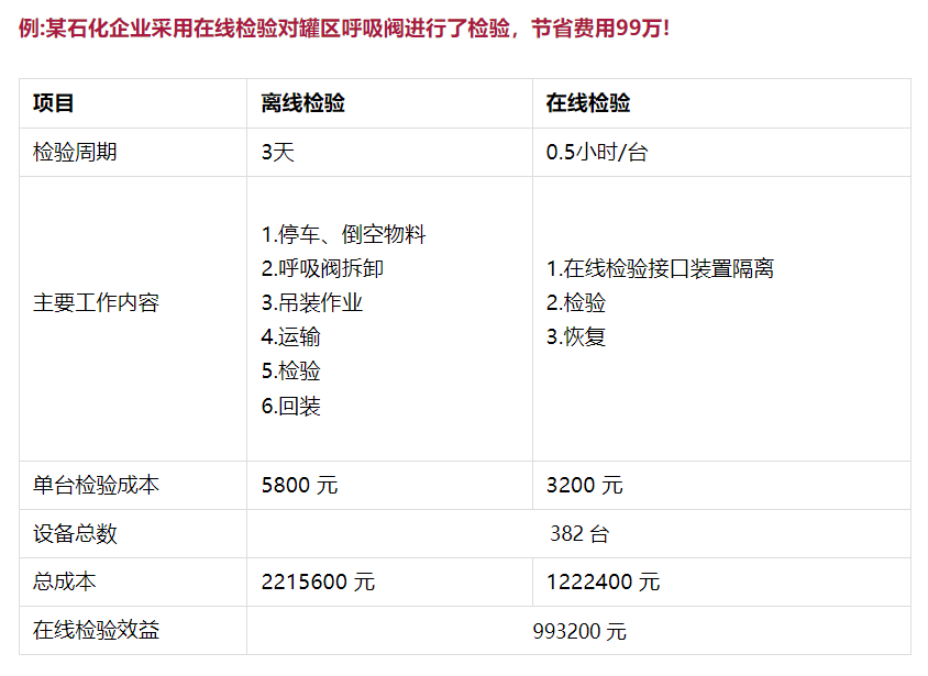 三、呼吸阀在线检验,成本低,效率高—普瑞泰格呼吸阀在线检验技术,让呼吸阀的检验在罐顶就能实现。把检验时间从几天降低到十几分钟,储罐不需要停产,能够为企业节省大量的费用。