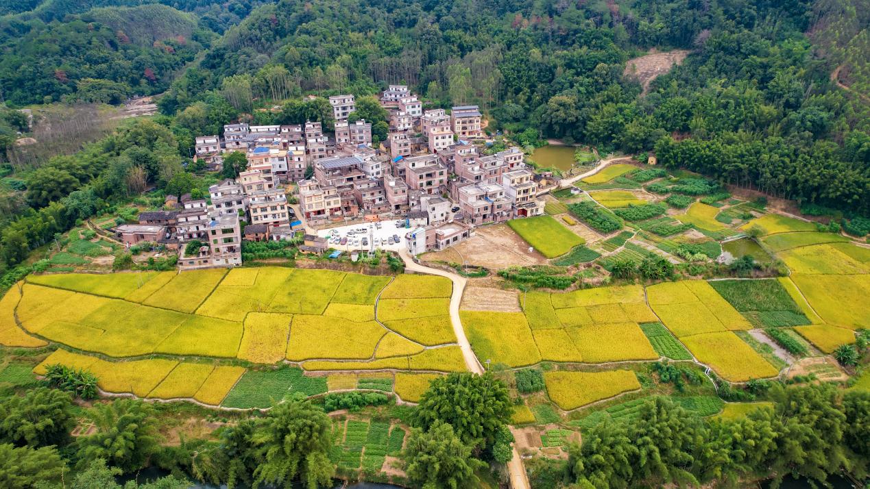 2025年10月27日,广西梧州苍梧县旺甫镇胜坡村,金黄稻田与青山河流、村庄、道路相互融合,一幅丰收图景徐徐展开。