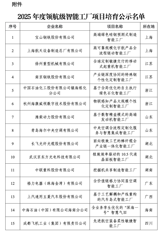 根据《关于开展2025年度智能工厂梯度培育行动的通知》(工信厅联通装函〔2025〕251号),现将拟入选的2025年度领航级智能工厂项目培育名单进行公示,请社会各界监督。如有异议,请在公示期内将书面意见反馈至工业和信息化部装备工业一司(智能制造处)。