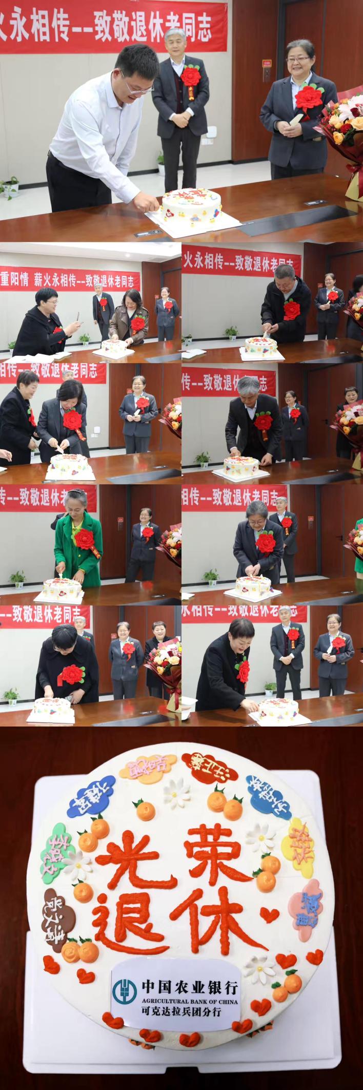活动最后,送上定制蛋糕,蛋糕上“光荣退休”的字样格外醒目,老同志们共同切开蛋糕,象征着农行可克达拉兵团分行与老同志们的情谊永不褪色,也寓意着农行可克达拉兵团分行的奋斗精神将代代相传,欢声笑语中,这场充满温情的致敬活动圆满落幕。