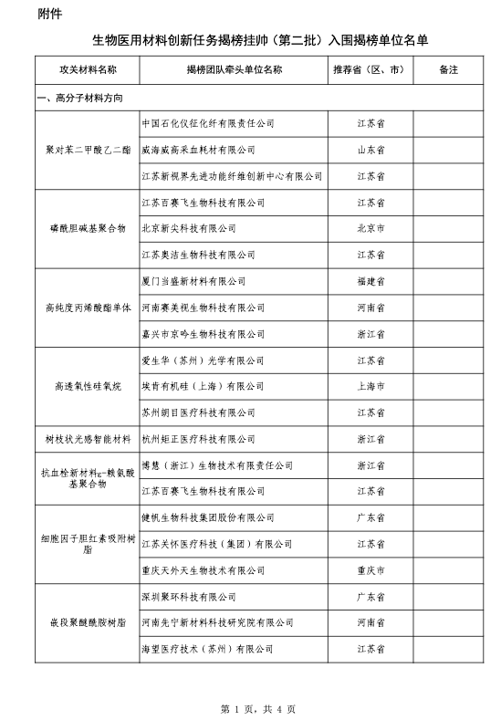 根据《关于组织开展生物医用材料创新任务揭榜挂帅(第二批)工作的通知》(工信厅联原函〔2025〕41号),经各地推荐、综合评审和网上公示,确定了生物医用材料创新任务揭榜挂帅(第二批)入围揭榜单位名单,现予以公布。有关事项通知如下: