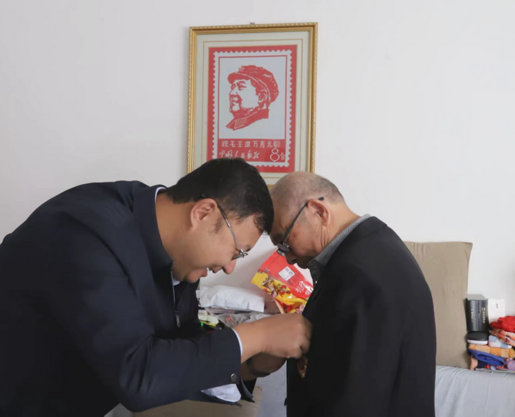 2025年10月24日,农行阿勒泰兵团分行党委委员、副行长郝天宇同志受分行党委委托专程前往退休老党员胡荣同志家中走访慰问,为其佩戴上熠熠生辉的“光荣在党50年”纪念章,送去组织的关怀与温暖,并致以崇高的敬意。