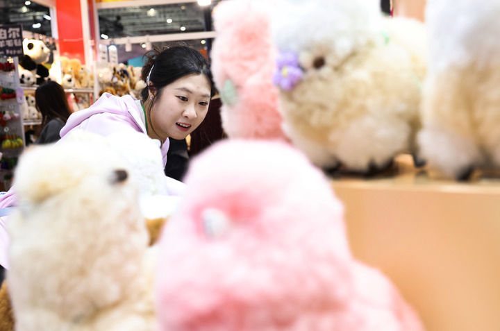 2025年11月8日,在第八届进博会消费品展区,参观者在秘鲁温暖驼品牌的羊驼毛制品前驻足观看。新华社记者方喆摄