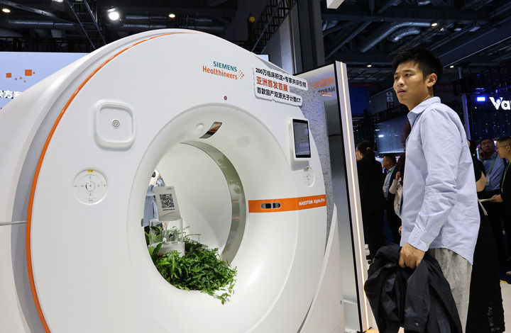2025年11月6日,参观者在进博会西门子公司展台一个CT机展品旁驻足观看,这是西门子公司首款国产双源光子计数CT,也是该产品亚洲首发首展。新华社记者方喆摄