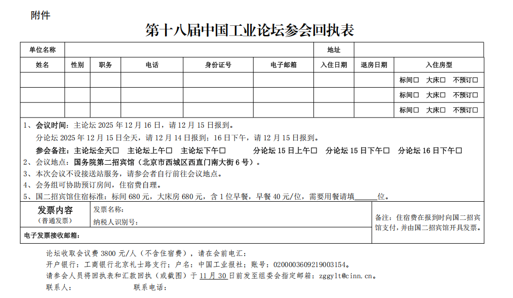 4.会议费3800元/人(含会议资料、16日主论坛午餐、晚餐费用,不含住宿、往返交通费用),可在会前电汇至指定账户。注意事项、付款账号及住宿标准等,请见《第十八届中国工业论坛参会回执表》。