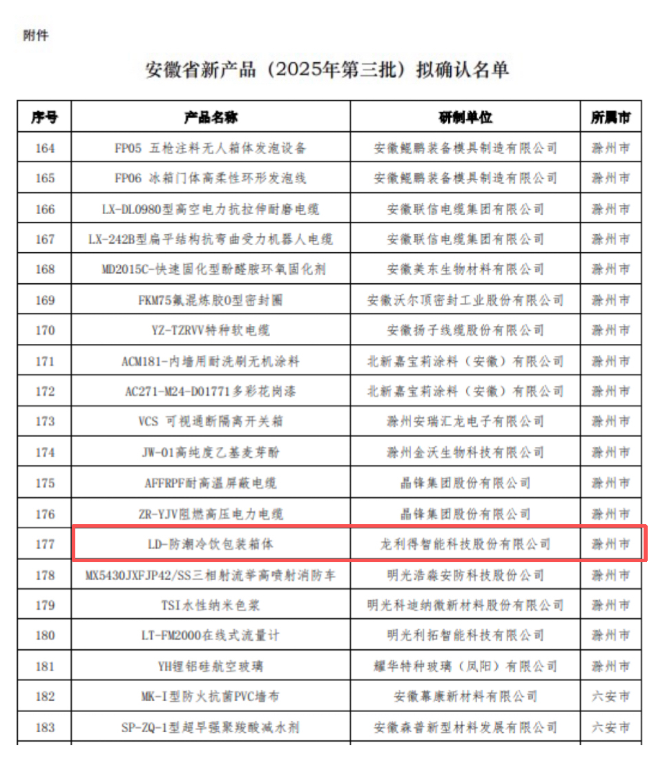 与此同时,针对冷饮行业运输环节的核心痛点——“低温环境下包装易受潮变形、保温性能不足影响产品品质”,龙利得精准发力,研发的“LD-防潮冷饮包装箱体”成功入选安徽省新产品拟确认公示名单。该产品通过特殊防潮涂层技术与密闭式结构设计,有效解决冷饮运输过程中的防潮、保温难题,同时兼顾轻量化与环保性,可广泛适配低温饮品、冷藏食品等冷链运输场景,为冷饮行业包装升级提供了创新解决方案,目前已进入市场推广阶段,获得行业客户高度关注。