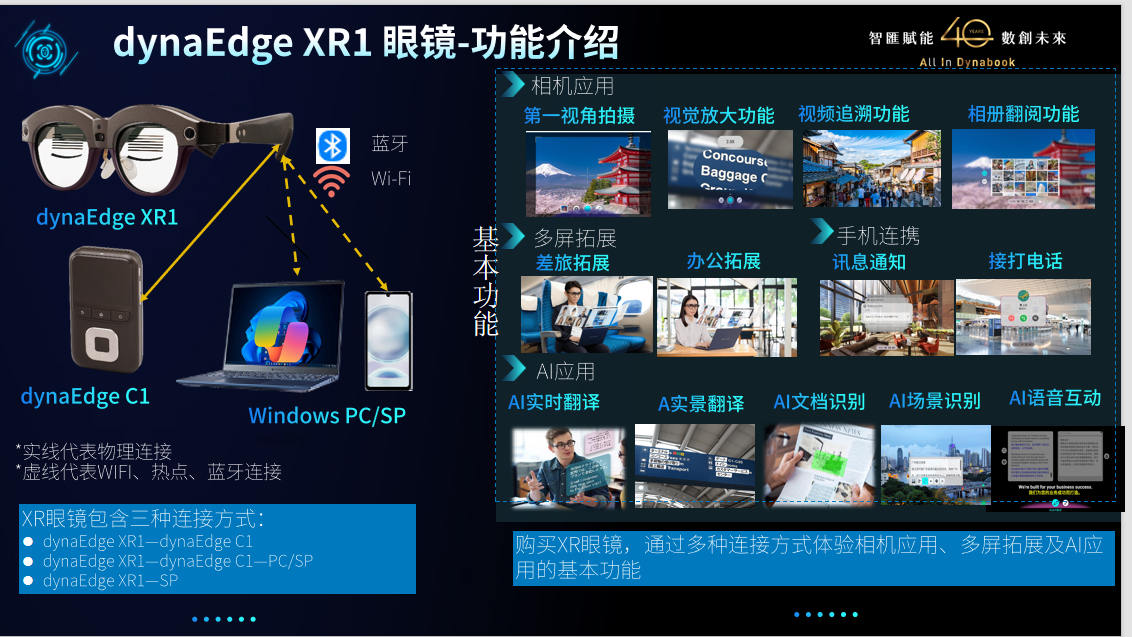 作为dynabook推动企业数字化转型的关键产品,dynaEdgeXR1智能眼镜正成为企业突破发展瓶颈、实现降本增效的重要利器。无论是制造业的远程支援、服务业的智慧升级,还是教育医疗的模式创新,dynaEdgeXR1都将以科技之力,为企业打开数字化转型的新视界,与客户共同定义产业智能未来。