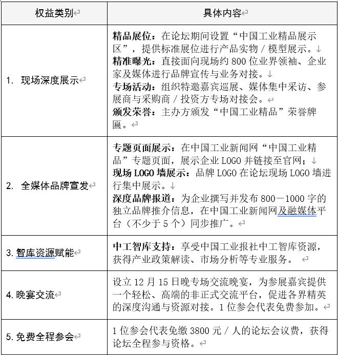 1.针对“‘2025中国工业精品’成果展”板块,现面向全国范围内优秀工业企业开展参展征集,入选企业可享受现场展览展示、全媒体品牌宣发、智库资源赋能、免费全程参会等多项权益。
