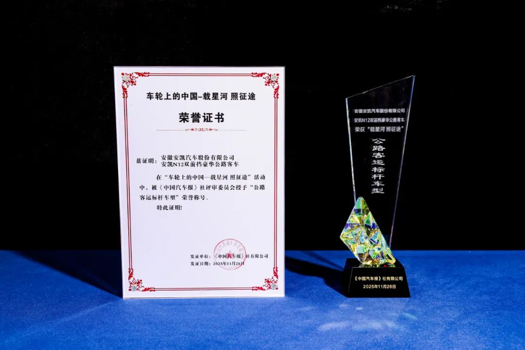 11月26日,在备受瞩目的“车轮上的中国”年度盛典环节中,安凯客车以卓越的综合实力荣膺“全球化领军企业”称号。同时,旗下明星产品安凯N12双前挡豪华公路客车凭借出色表现斩获“公路客车标杆车型”荣誉称号。双誉并收,彰显了安凯客车在产品创新与全球战略上的双重突破。