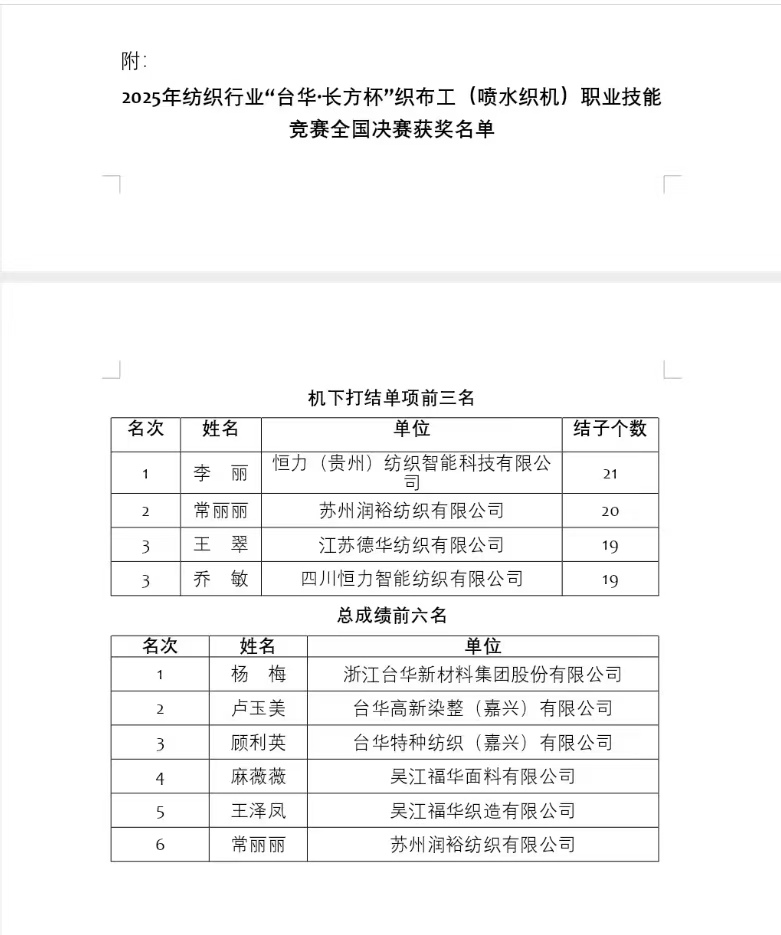 11月25日至27日,2025年纺织行业“台华·长方杯”织布工职业技能竞赛全国决赛在浙江台华举办,共有来自江苏、浙江、安徽、福建、江西、山东、河南、湖北、四川、贵州10省的59名选手,经过激烈角逐,决赛出总成绩前六名和机下打结单项奖前三名。中国长丝织造协会会长王加毅表示,职业技能竞赛是发现人才、培育人才的绝佳平台,要以每次大赛为契机,将竞赛标准应用于日常教学与培训,推动形成“以赛促学、以赛促训、以赛促评”的良好局面,让更多优秀技能人才通过竞赛“脱颖而出”。