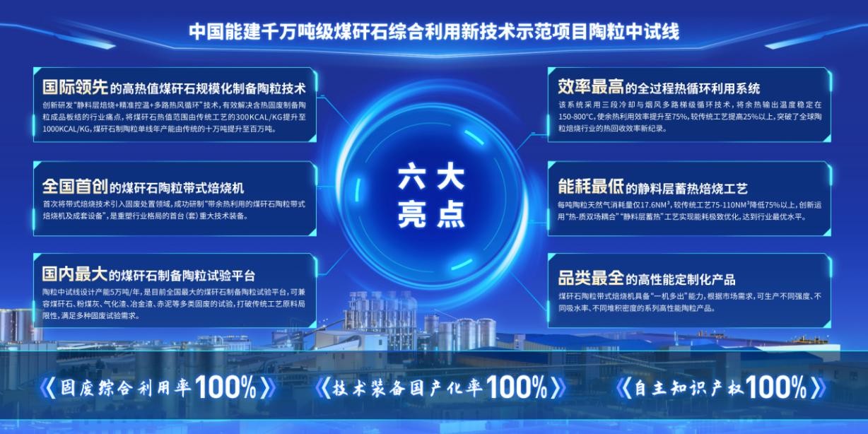 该项目创新不仅体现在“六大核心亮点”:国际领先的高热值煤矸石规模化制备技术,将适用热值范围提升至1000kCal/kg;全国首创的煤矸石陶粒带式焙烧机,打破传统技术局限;国内最大的试验平台,可兼容多类固废试验;创纪录的热循环系统,余热利用效率达75%以上;行业最优的能耗控制,天然气消耗降低75%;全品类的产品体系,满足多元市场需求。同时还实现了三大“百分百”突破,一是固废综合利用率达100%,通过先进分选和利用技术实现煤矸石全量转化;二是技术装备国产化率达100%,核心设备全部自主研发;三是自主知识产权达100%,拥有完整的工艺体系。