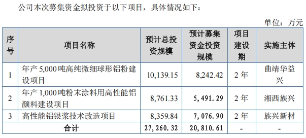此次登陆北交所的IPO募投项目,是族兴新材为实现未来跨越式发展的关键布局,所有规划均紧密围绕核心业务展开。项目总投资预计约2.73亿元,拟投入募集资金约2.08亿元,具体涵盖三大方向:年产5,000吨高纯微细球形铝粉建设项目、年产1,000吨粉末涂料用高性能铝颜料建设项目,以及高性能铝银浆技术改造项目。