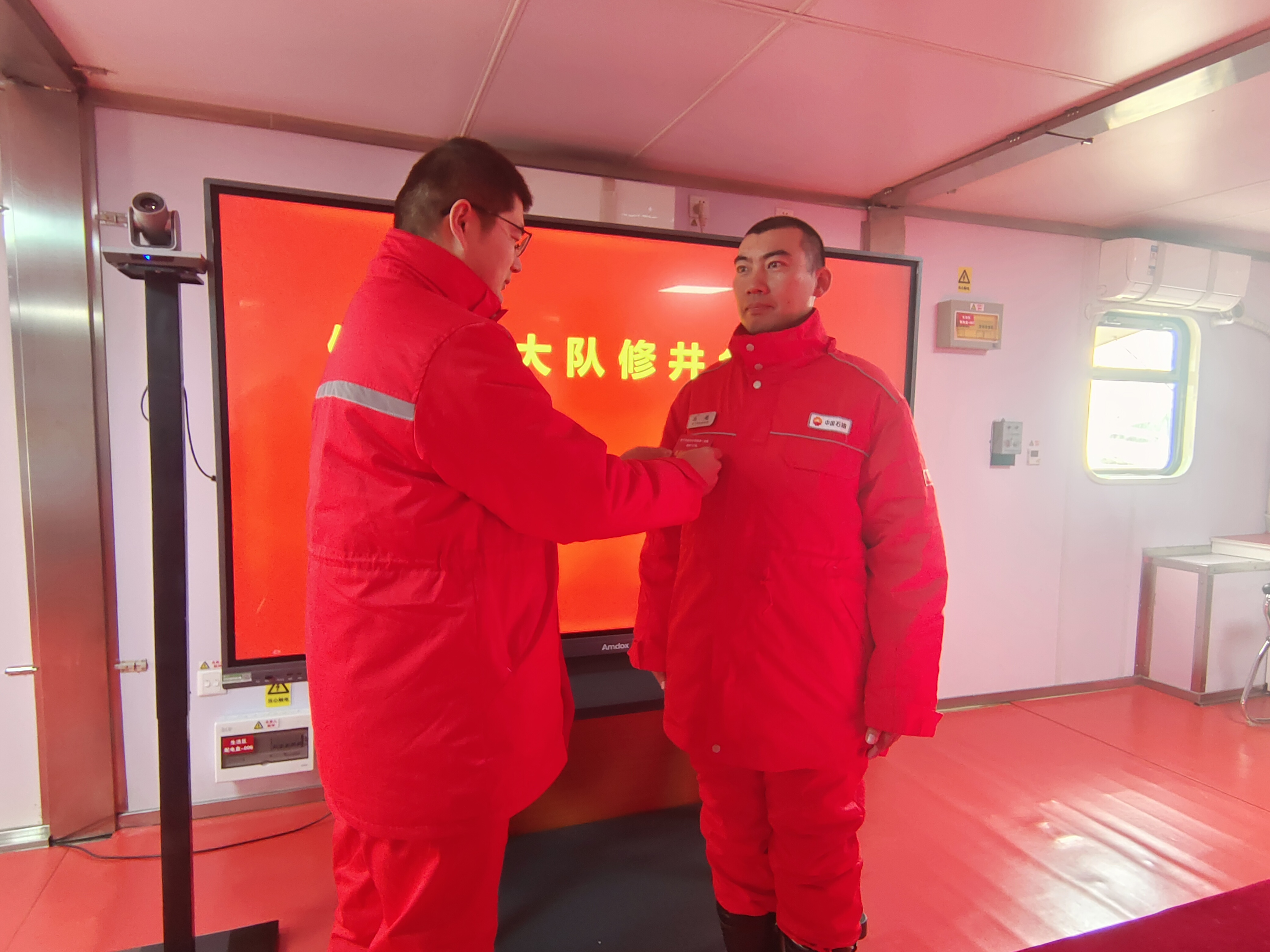 活动开始前,修井107队队长胡雪健宣读红色网格核心职责,明确网格单元长需统筹“操作、生活、环保、工具”四大责任区,“六大员”在做好本职工作的情况下协同补位,如安全环保监督员紧盯28项巡检点位、政策主张宣传员实现精神宣贯全覆盖,清晰的职责划分让每一位网格员都明确了“干什么、怎么干”。随后,党支部书记周佰龙逐一宣读网格长及网格员任命名单,并为A/B/C网格单元长授卡,明确区域管理职责,单元长再为12名网格员递上胸卡,完成网格身份确认的“关键一步”。网格胸卡与身上的“石油红”交相辉映,现场的网格员们不约而同挺直腰板,眼神坚定。