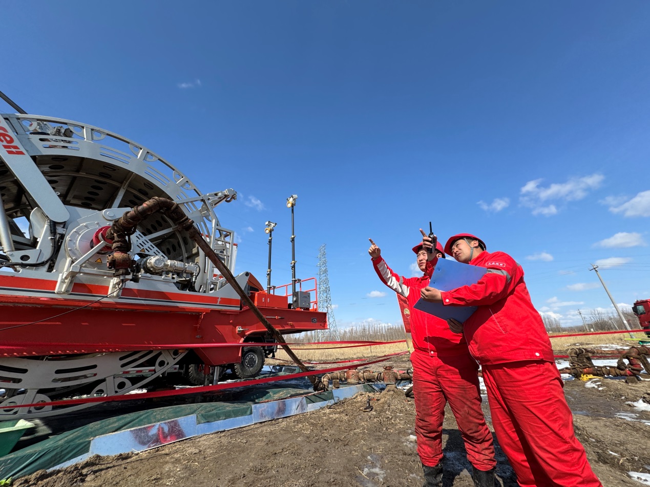 技术赋能,筑牢防堵“防火墙”。针对连续油管作业中天然气水合物生成导致冰堵的风险,大队采取多项针对性技术措施。在物理防控上,灵活采用热风装置对井口区域进行主动加温,使用伴热带对关键设备进行局部保温;在化学干预上,科学选用冰点较低的氯化钾、氯化钙等防冻溶液,在施工间隙将其注入地面盘管与管线,有效替换并保护管内流体,防止结冰堵塞。同时,创新生产组织模式,在压驱、缝网改造等大液量井施工中,采用24小时连续泵注作业,依靠流体持续流动产生的热量替代部分静态保温措施,显著降低管线冻堵风险。在作业间隙及收尾阶段,采用氮气吹扫工艺,确保设备在长时间非作业状态下无冻堵。