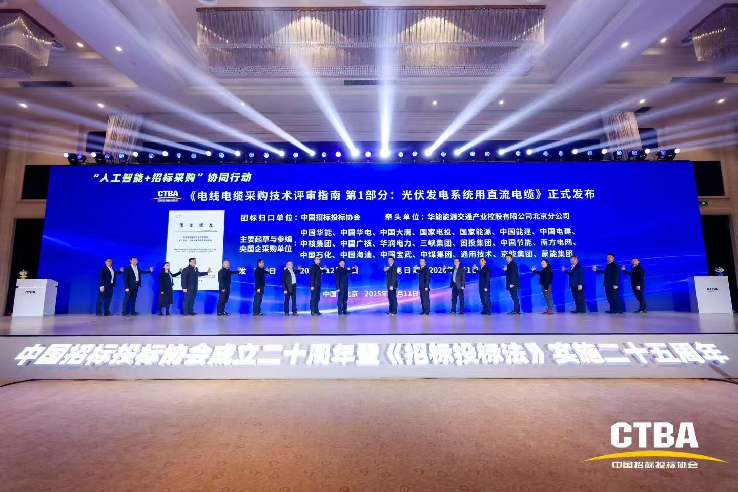 12月11日,由中国华能集团牵头,中国华电、中国大唐、国家电投、国家能源等央国企采购单位参编,中国招标投标协会(以下简称中招协)归口管理的团体标准T/CTBA007.1—2025《电线电缆采购技术评审指南第1部分:光伏发电系统用直流电缆》(以下简称《光伏电缆采购技术评审指南》)首发仪式在北京举行。中标协与多家央企、国企代表出席并共同为标准首发揭幕。