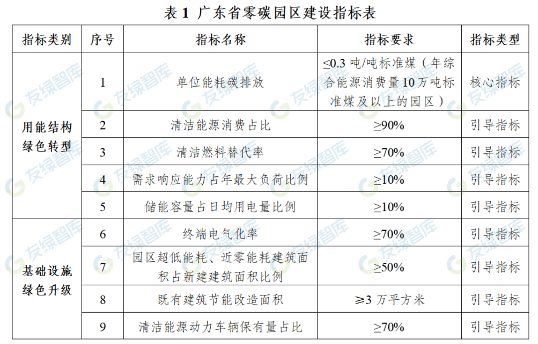 附件1《广东省零碳园区建设指标体系(试行)》设置20项指标,其中单位能耗碳排放≤0.3吨/吨标煤为核心指标(适用于年综合能耗≥10万吨标煤的园区),其余19项为引导指标,涵盖清洁能源占比(≥90%)、终端电气化率(>70%)、建筑节能、交通清洁化、固废利用、碳足迹管理等维度。相比《国家级零碳园区建设指标体系(试行)》,既兼顾地方实际,又更为细致。