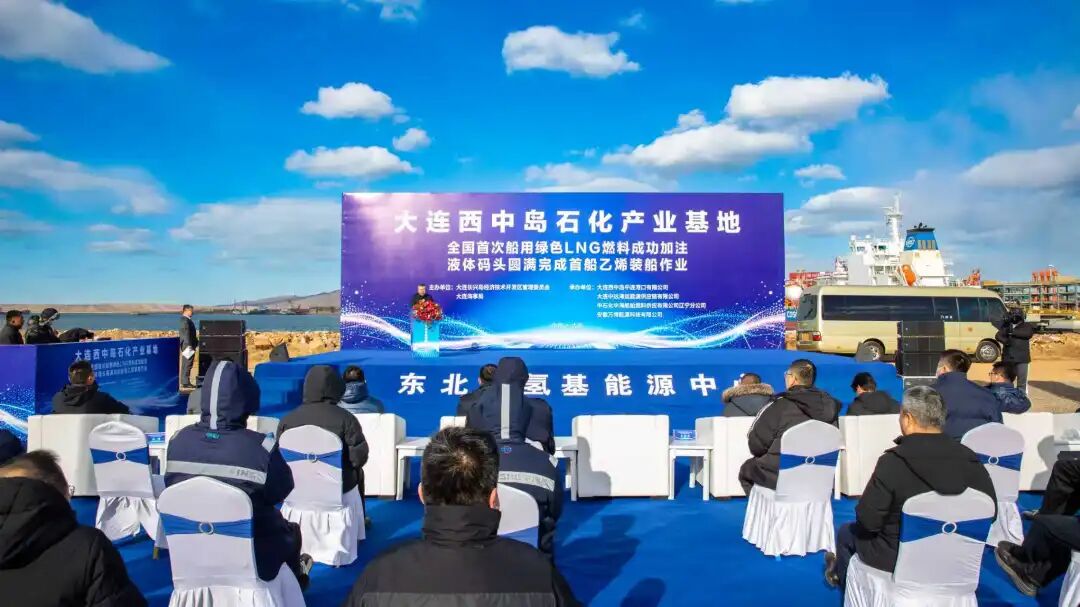 12月3日,大连长兴岛(西中岛)石化产业基地全国首次绿色LNG燃料加注暨液体码头首船乙烯装船作业仪式在西中岛液体码头举行。此次作业船舶系大连中远海运能源供应链有限公司“兴盛源”轮,标志着基地在“原料接卸-生产加工-成品发货”全链条物流体系上实现关键突破,为打造大连东北亚氢基能源中心、推动大连“三个中心”建设和东北全面振兴注入强劲动力。区党工委委员、管委会副主任常剑峰出席仪式并致辞。