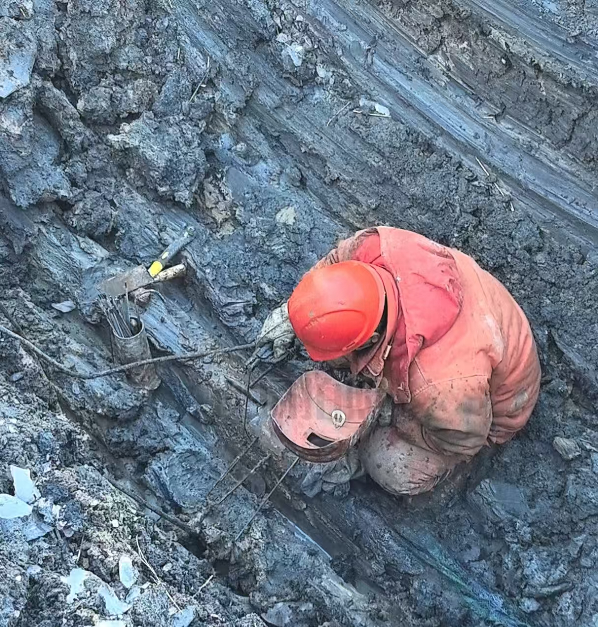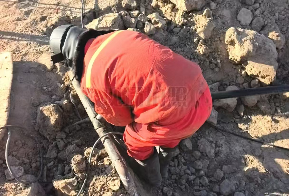 到达现场后,杨刚根据管线走向进行仔细摸排,将疑点确定在本班组与注采204班之间。由于疑点是在一个低洼水坑内,杨刚奋不顾身的蹚进水里寻找,最终确定漏点位置。因坑内全是积水无法进行堵漏操作,没过一会儿,副班长袁圣皓带领挖沟机赶到了事故现场。一声轰鸣后,挖沟机挥舞着“铁手”开始行动。仅用一会儿工夫,将坑内的污水全淘出。