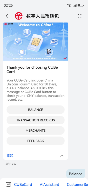 外国游客抵达首都机场或大兴机场后,在专门服务外国游客的BeijingService专区联通服务点凭护照即可办理幂方卡。办理后,游客可使用境外银行卡或现金为数字人民币钱包充值,并随即收到联通发出的幂方卡5G消息欢迎信息。