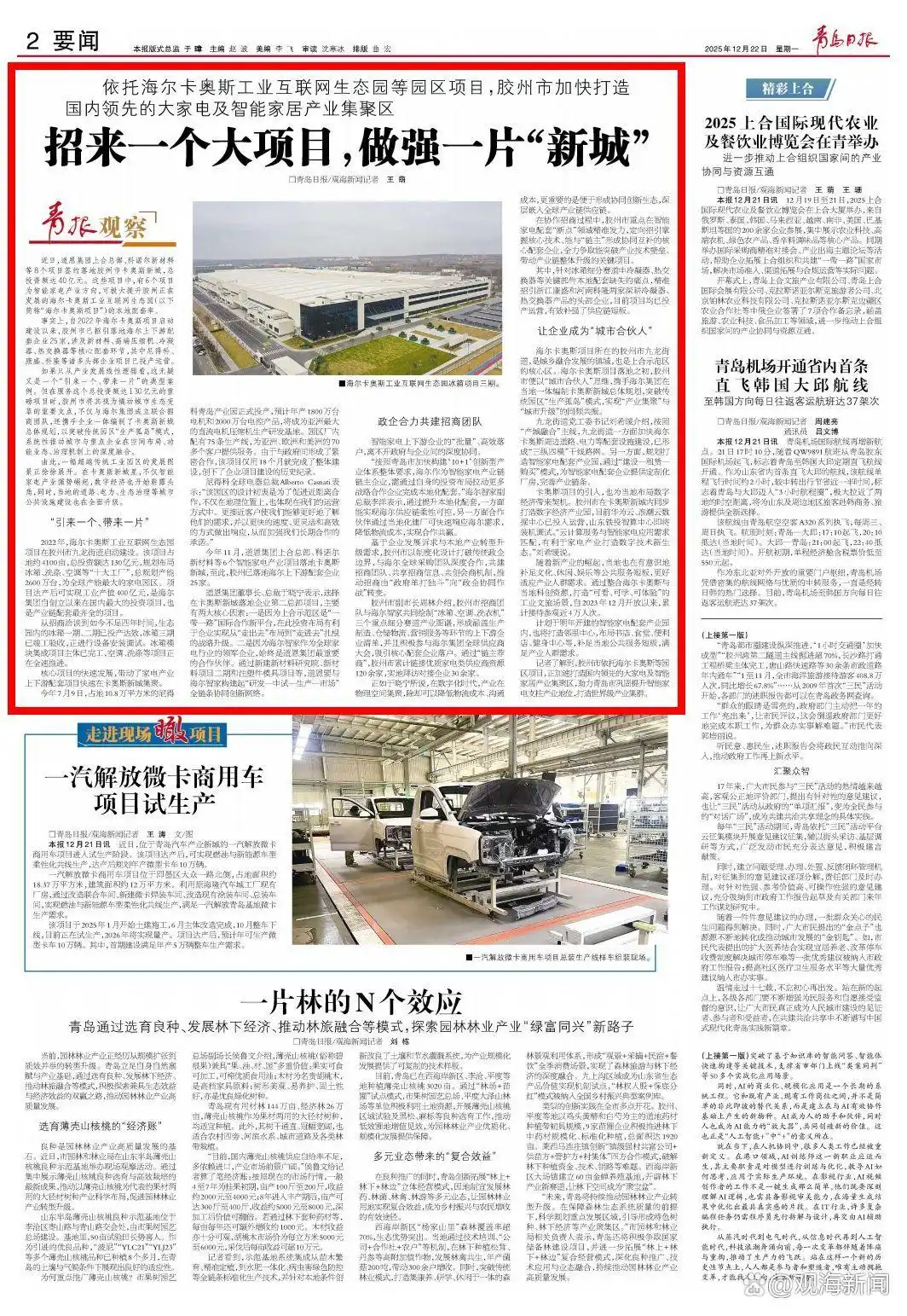 记者了解到,胶州市依托海尔卡奥斯等园区项目,正加速打造国内领先的大家电及智能家居产业集聚区,助力青岛市巩固提升智能家电支柱产业地位,打造世界级产业集群。(青岛日报/观海新闻记者王萌)