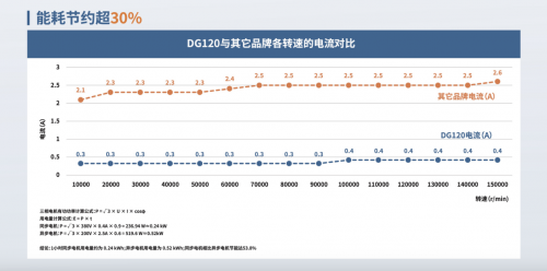 实测数据显示,这款主轴运行电流仅0.4A,而进口异步电机主轴电流高达2.5A。按三相电机功率公式计算,DG120每小时用电量仅0.24kWh,比进口同类异步电机产品节省53.8%。“一台主轴每天运行8小时,一年就能省1400多度电,按工业电价算能省近千元,三年省出的电费就够买一台新主轴。”技术总监郭总算了一笔经济账。