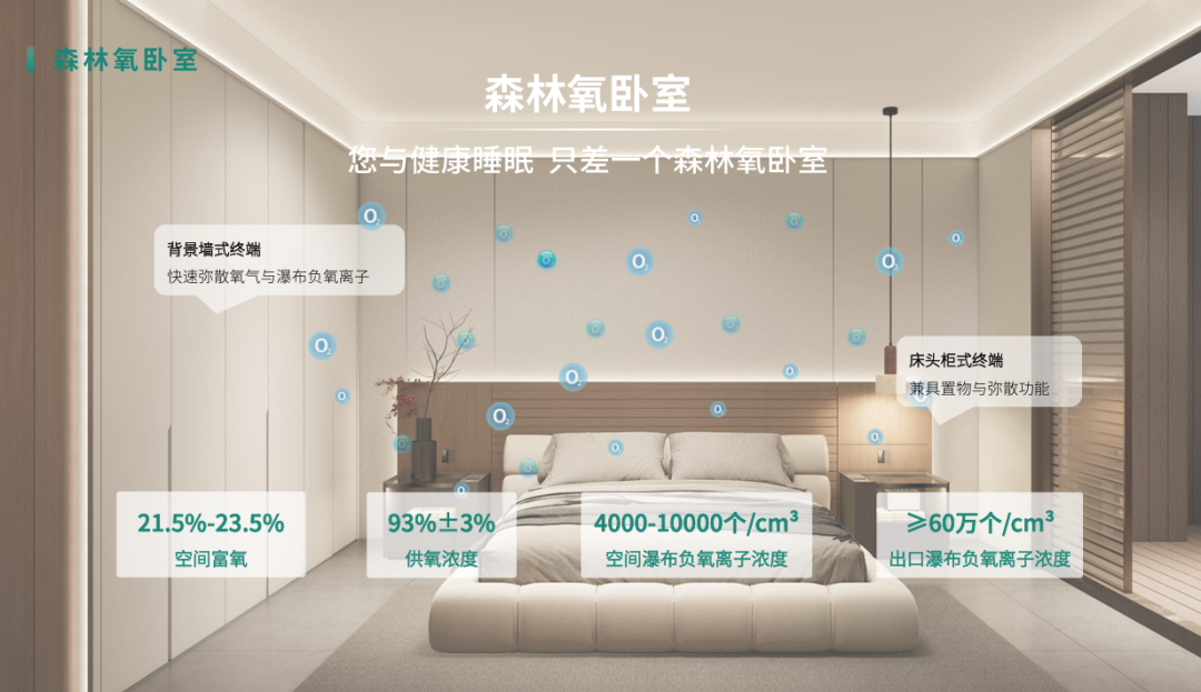 “森林卧室”场景由负氧瀑布离子系统、管网终端、森林氧环境气候管家三大部分技术组成,可营造出森林级睡眠环境,具有智能联控功能,并支持远程操作与数据同步。