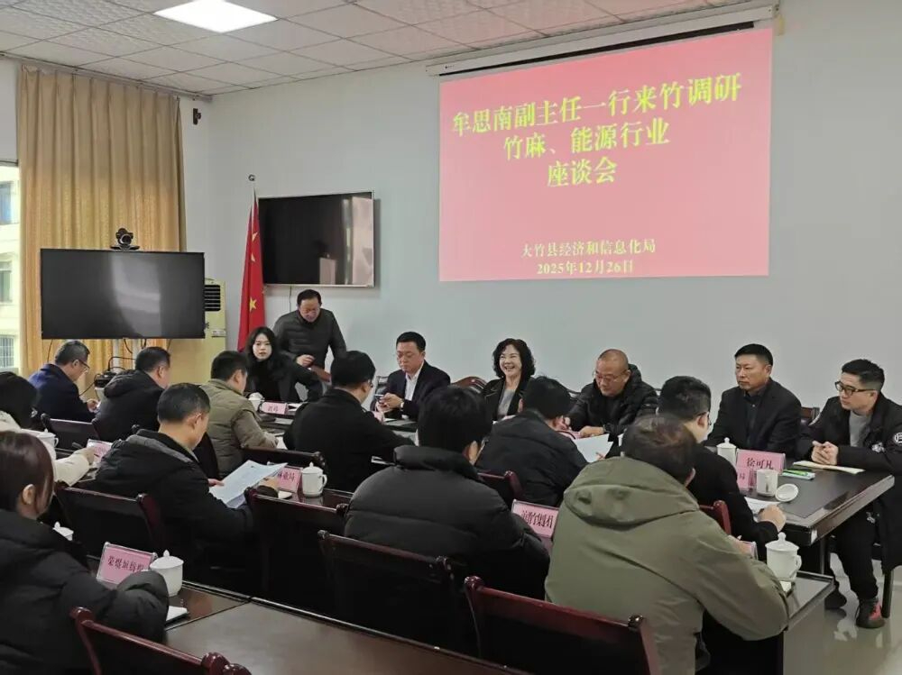 在随后的竹麻、能源行业座谈会上,牟思南一行与大竹县经信局、县发改局、县财政局、县林业局领导其企业代表就产业定位与能源战略协同、品牌建设与能源转型融合、低碳技术与能源效率提升、平台构建与政策保障等方面进行了探讨。