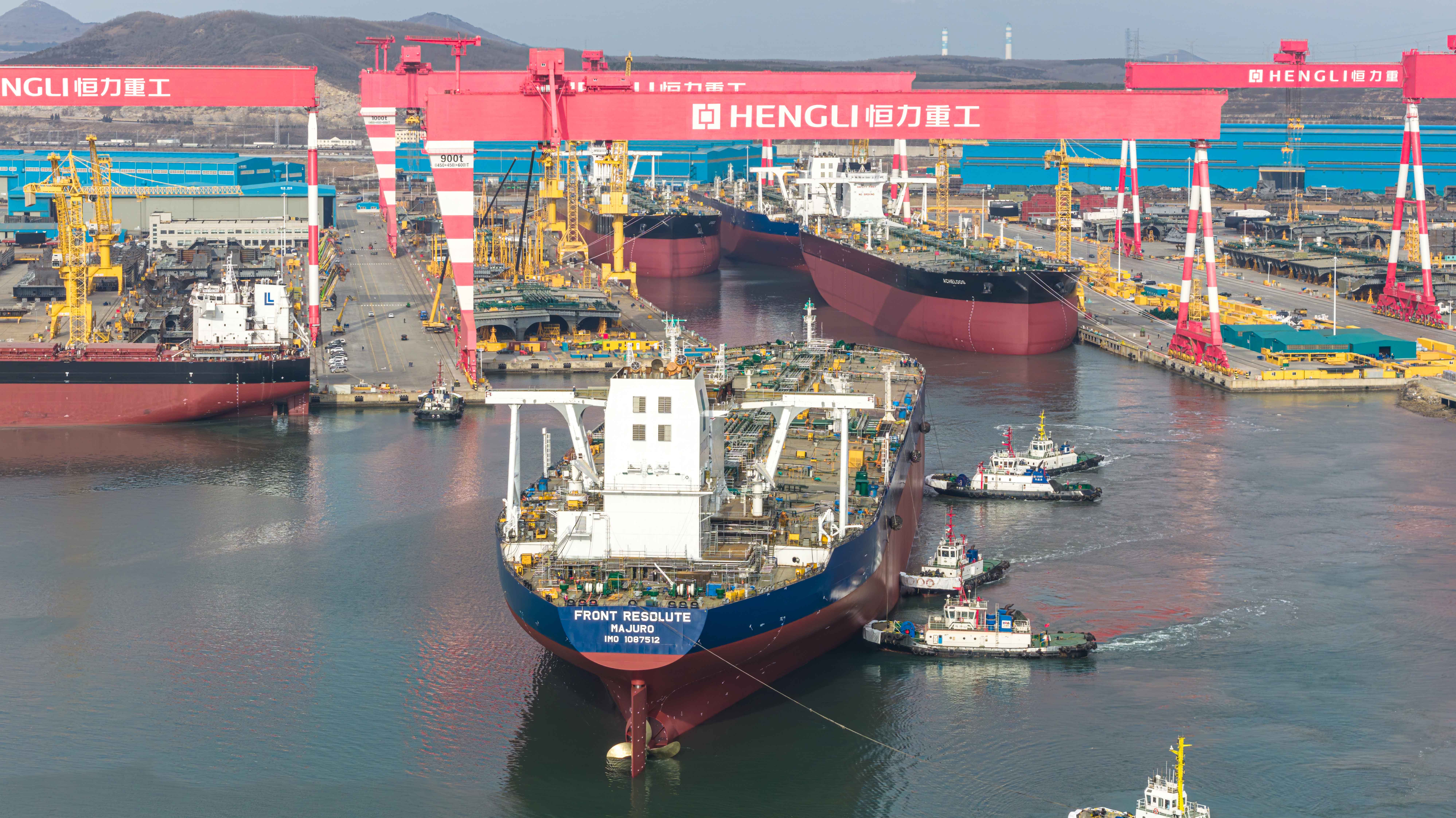 这是恒力重工的第一次,也是世界造船史上的第一次。1号船坞长741米,宽135米,可同时建造4艘30万吨级VLCC/VLOC。本次4艘30.6万吨VLCC同一天出坞,规模空前,这是恒力重工全面运营以来的第一次,也是全球造船业的第一次,在世界造船史上写下了浓墨重彩的一笔。