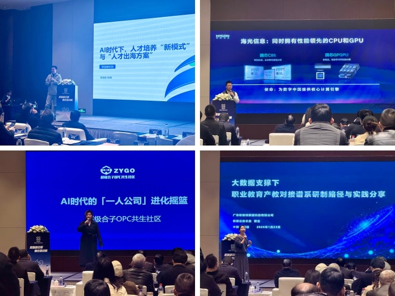 活动紧扣“数智新引擎”主题,多家企业代表带来前沿实践案例,奇安信提出“以模治模”的大模型安全防护方案,安捷睿机器人展示AI驱动材料研发新范式,瀚天天成介绍碳化硅半导体外延技术的产业化进展,深信服与海光信息分别从人才培养、芯片生态角度探讨AI时代产教融合的创新路径,太初合一推出“超级合子OPC共生社区”助力“一人公司”孵化,职教桥则通过数据驱动实现职业教育与产业需求的精准对接。
