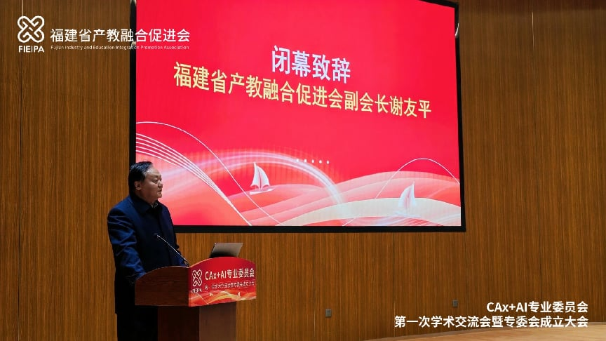 福建省产教融合促进会副会长谢友平在闭幕致辞中,对大会的成功举办给予了高度评价。他指出,本次大会高效务实,不仅完成了专委会的组建,更通过高密度的思想交流,清晰地看到了CAx与AI融合的广阔前景。他强调,专委会肩负着汇聚智慧、搭建“政产学研用金”协同平台、攻克“卡脖子”技术、推动自主可控工业软件生态建设的战略使命。谢友平对专委会未来的工作提出了三点期望:在“产教融合”上见深度,打破科研与产业应用的壁垒;在“服务产业”上见实效,提供可落地的解决方案;在“构建生态”上展现格局,打造健康、开放、创新的产业生态圈。他坚信,在全体成员的共同努力下,专委会必将茁壮成长,为产业发展贡献重要力量。