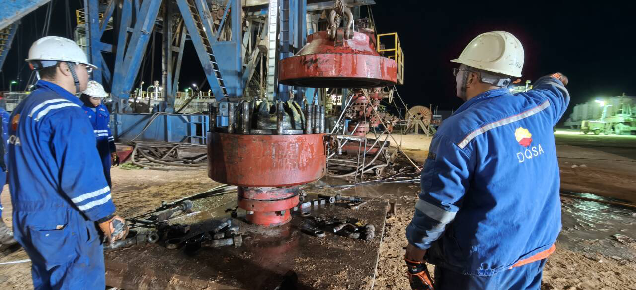 搬家推进过程中,设备检测、安全合规验收等多项工作并行开展,一线作业人员被分散;阿美公司的“工作许可须经老井签字确认并送达新井场后方可施工”的严苛要求,导致衔接环节存在不可控的延迟,进一步推迟了整体进度。更令人措手不及的是,开钻调试阶段井控设备试压环节突发环形防喷器漏油故障,从基地调运更换环形防喷器直接造成将近0.5天的工期损失,让本就吃紧的进度雪上加霜。DQ058队全体人员不等不靠、迎难而上,迅速优化作业方案、精准破解瓶颈。