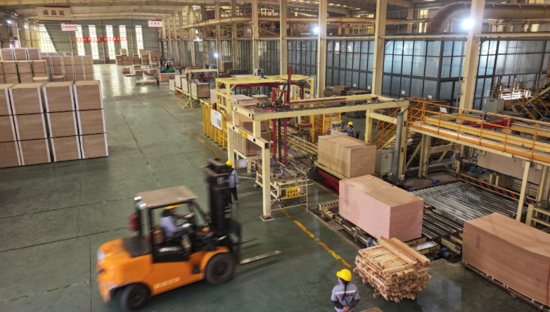 走进康贝德新材料公司生产车间,自动化生产线正高速运转。从原料投放、拌胶铺装,到热压成型、精密裁切,各道工序通过中央控制系统实现无缝衔接;机械臂规律舞动,一张张平整光洁的刨花板在传送带上快速流动,整个车间呈现出高效有序的生产景象。